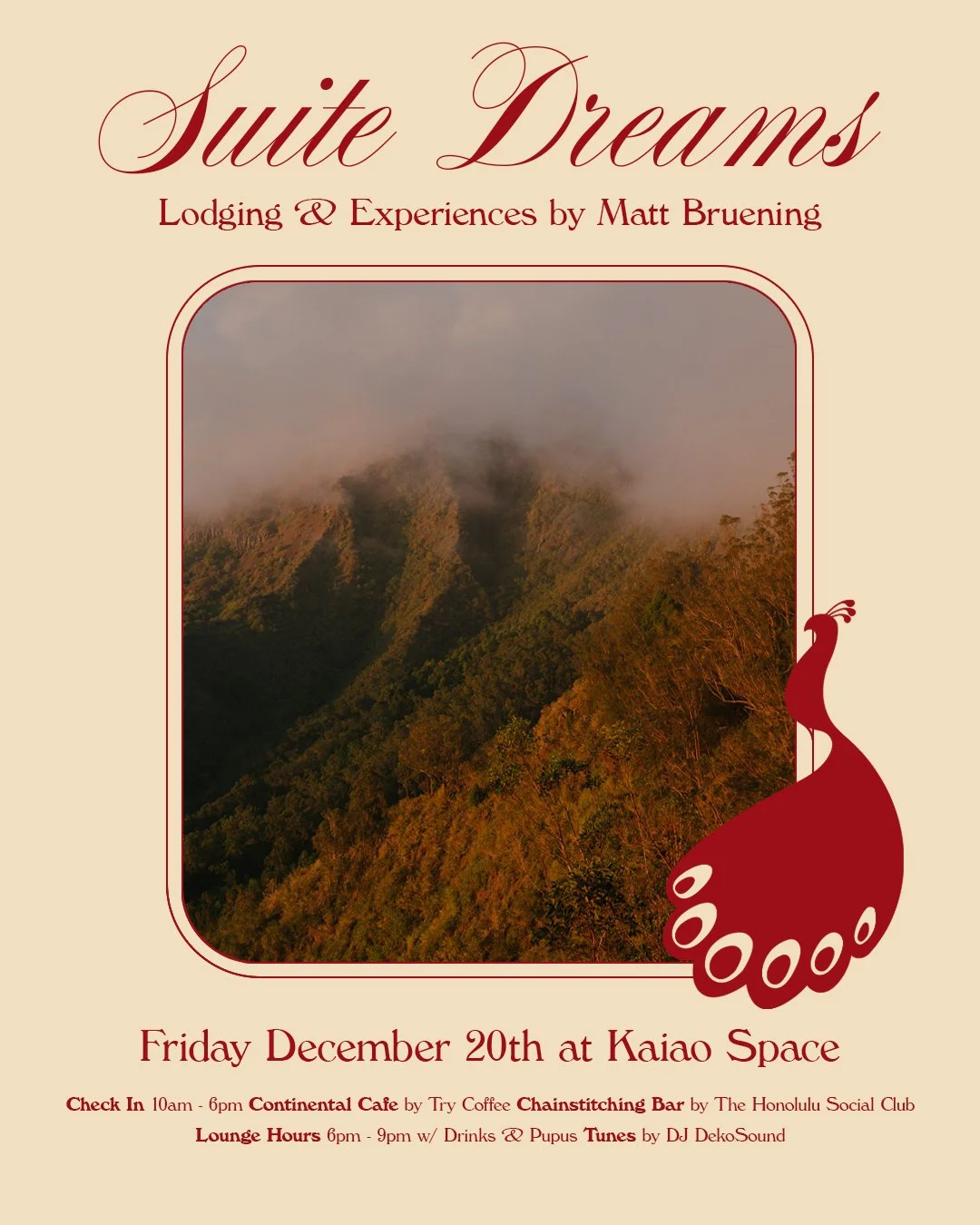 SUITE DREAMS - Kaiao Space! Friday, December 20, 2024 12:30 PM 12:30 Saturday, December 21, 2024 4:30 PM 16:30 MATT BRUENING 949 McCully Street McCully - Moiliili, HI, 96826 United States (map) Google Calendar ICS come check out our concept store at Kaiao space for our holiday pop up! Our theme is hotel and lodging and we’re hoping to let you in on a little sneak peek of where we’re geared towards for new things in the year to come! Happy Holidays!